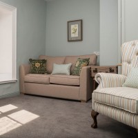 The connecting lounge has a Hypnos sofa which converts to an excellent double bed if required along with a separate comfy chair and large upholstered footstool. There is a second large flat screen TV in the lounge area. The freestanding wardrobe and all the tea and coffee equipment is here for you to have that welcome cup of tea whilst you sit in the comfy seat after a long day.
