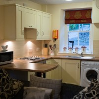Downstairs is a well-equipped modern kitchen with Oven and hob and extractor fan, Washer Dryer, Microwave, Fridge with freezer compartment.